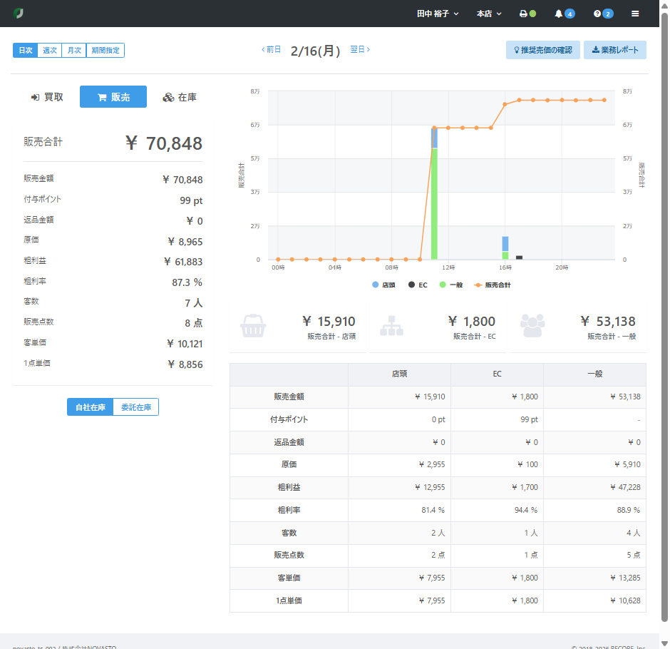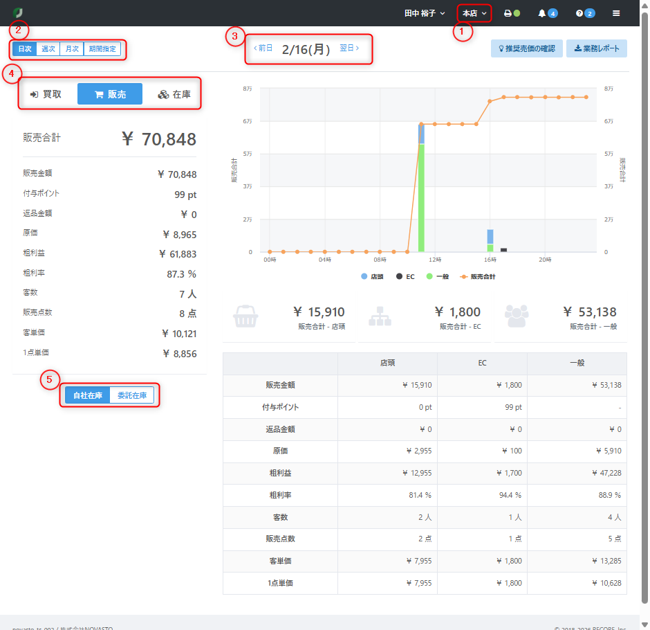 ・販売:販売系の対象メニューより販売確定によりリアルタイムに集計反映