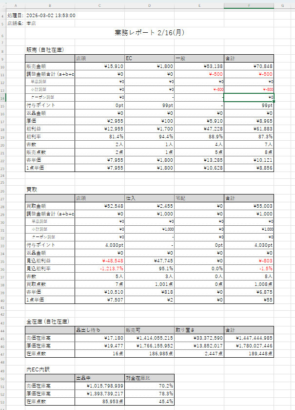 表示された情報は、Excel形式の「業務レポート」として出力可能です。日々の数値報告や経営指標の確認にご活用ください。