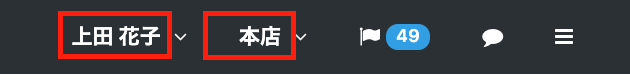 ReCOREへログインすると、画面右上に、操作ログインしているスタッフのお名前とアカウントの店舗名が表示されます。