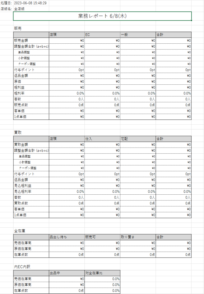 【業務レポート】ボタンをクリックすると、以下のようなレポートをダウンロードすることができます。