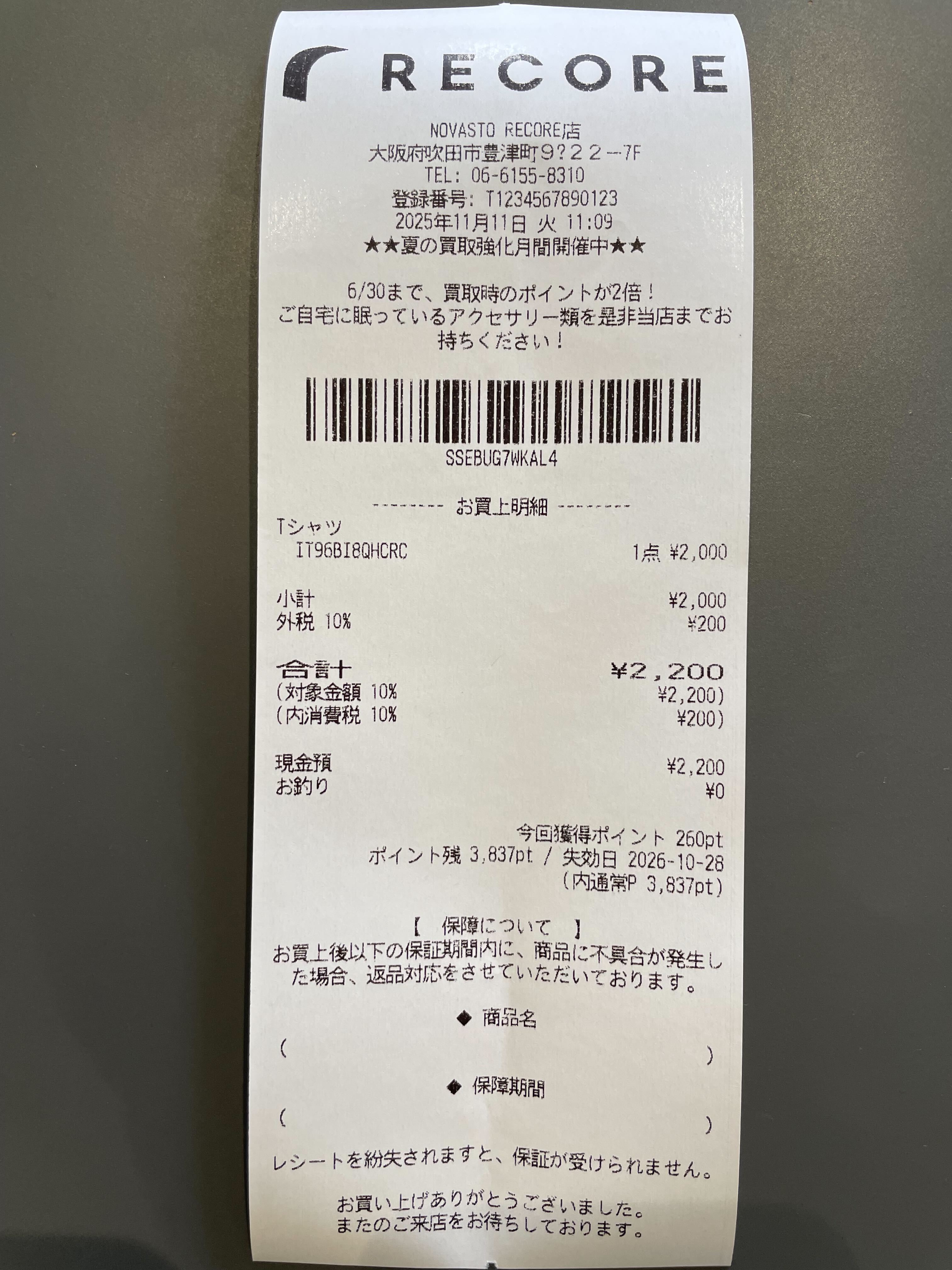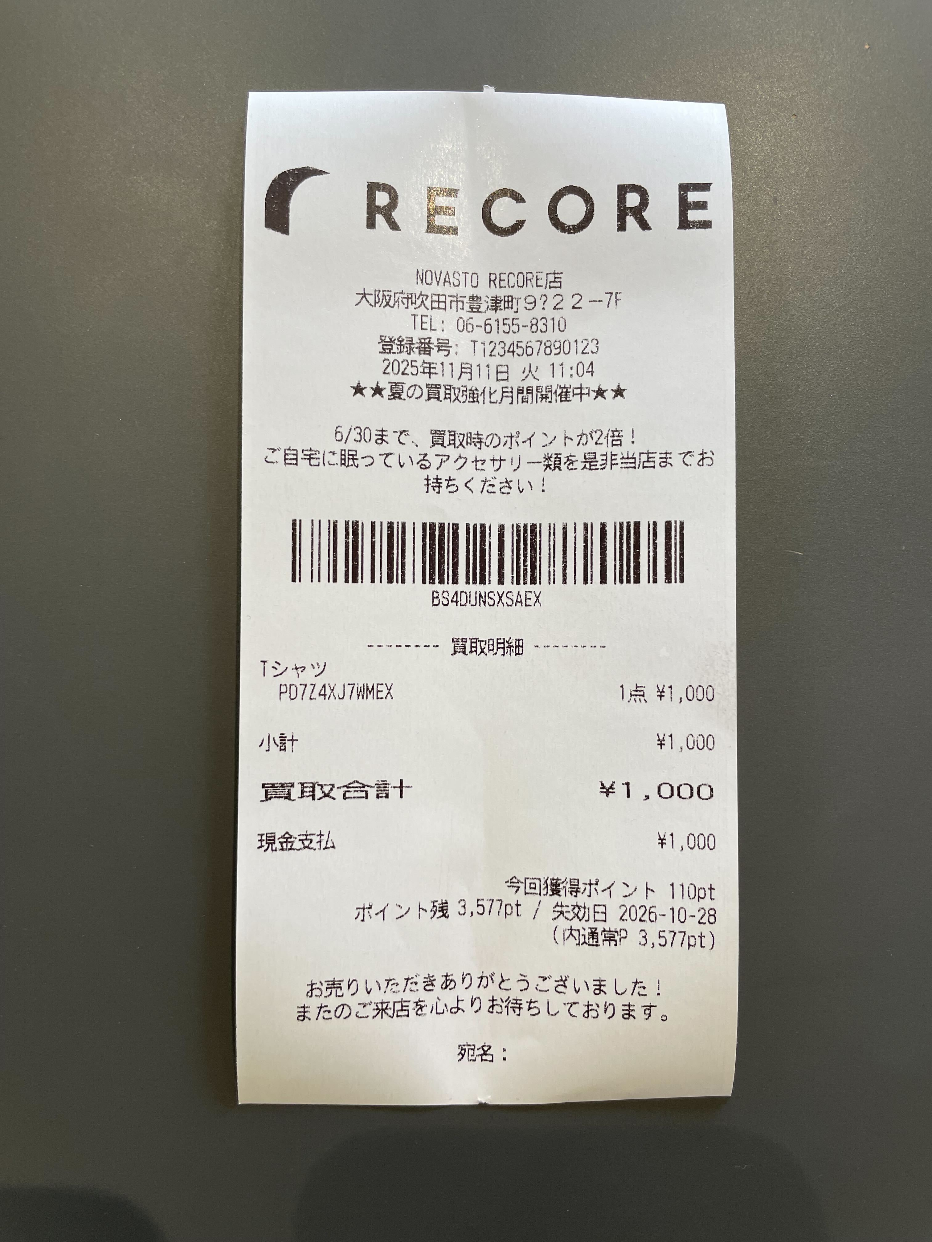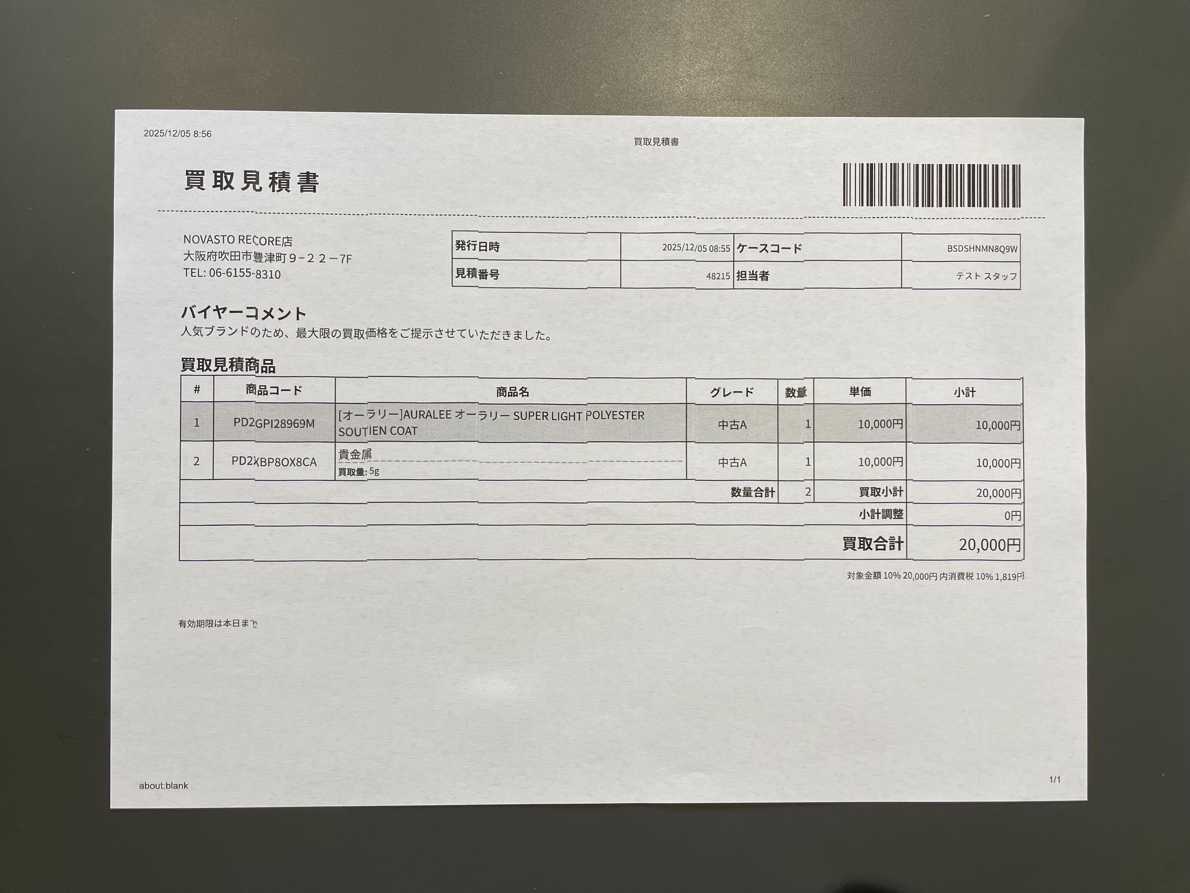 種類:レシート(買取) 用途:店頭買取より買取確定後にお客様にお渡しします