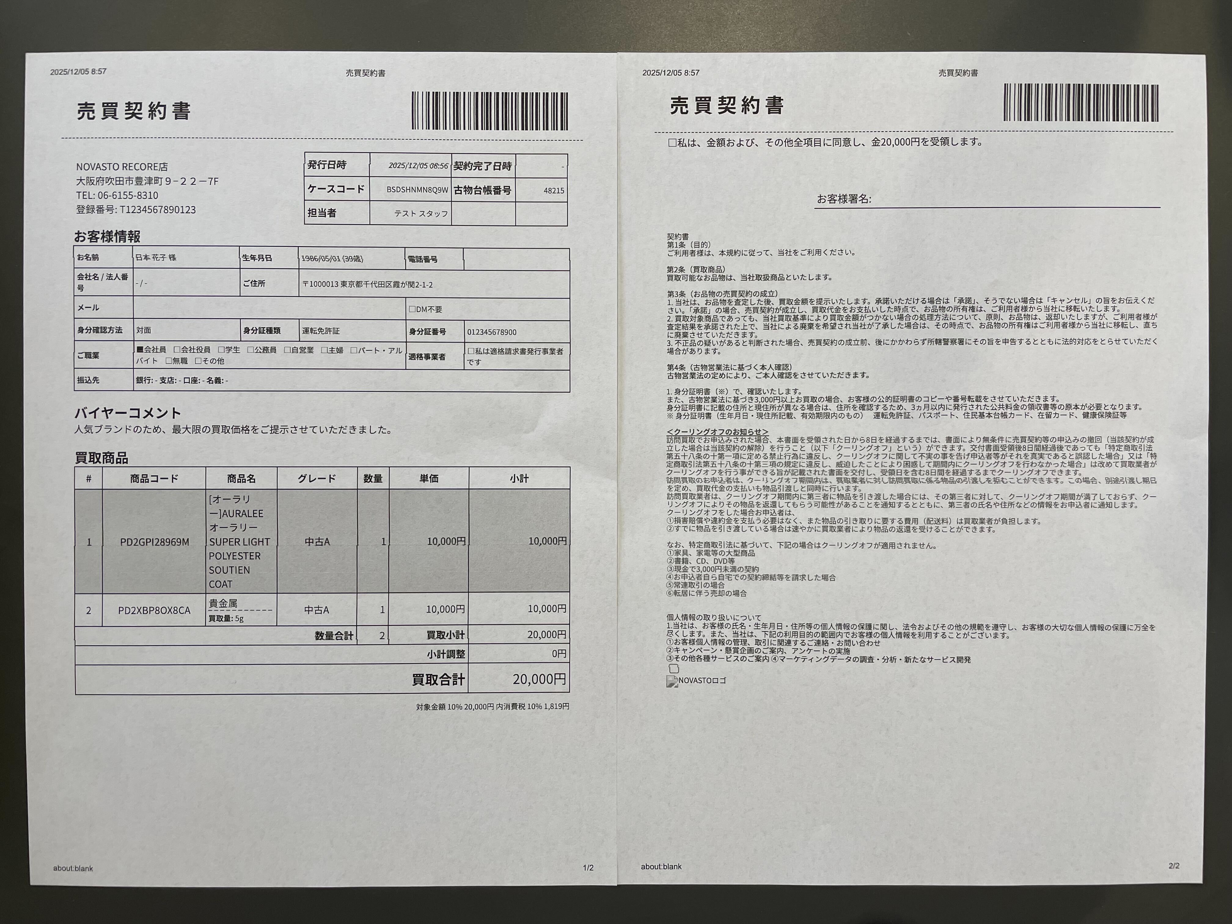 種類:売買契約書 用途:店頭買取において売買契約書を出力する際に活用します