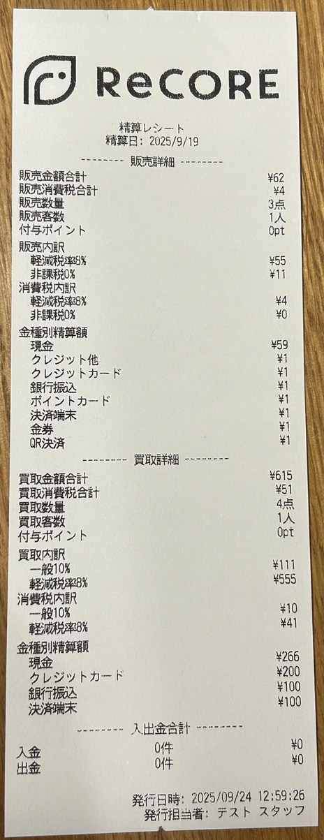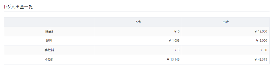 【会計>レジ入出金】より入出・出金操作された金額の内訳合計を表示します。