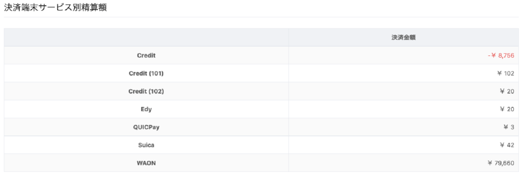 決済端末にて精算した金種毎の決済金額を表示します。