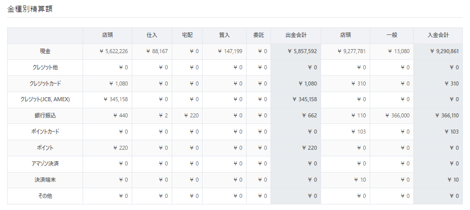 買取・質入れ・委託・販売の支払いの金種毎の合計金額を表示します。