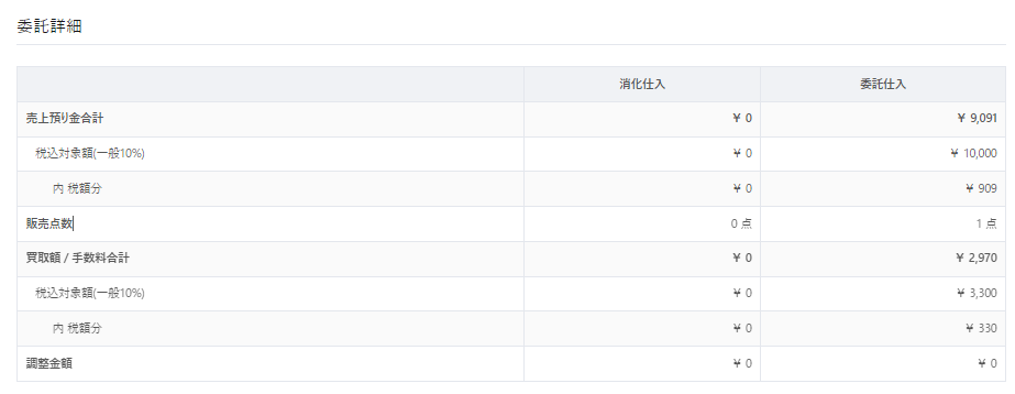 2 | 税込対象額 | 指定した期間に仕入商品の支払いを確定した預り売上合計(税込) ※指定した期間に委託仕入の支払いを確定した商品のみ表示 例)『一般10%』は、仕入商品のカタログ(PDコード)に指定されている税率タイプ毎に集計されます。 内 税額分:指定した期間の仕入商品における税額のみ合計 |