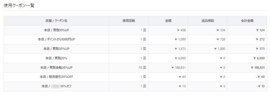 【店頭買取】【店頭販売】において使用した各クーポンの状況を表示します。