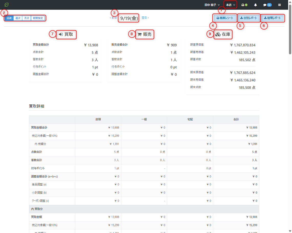 9 | 付与ポイント | 指定した期間の販売における付与ポイント数の合計 |