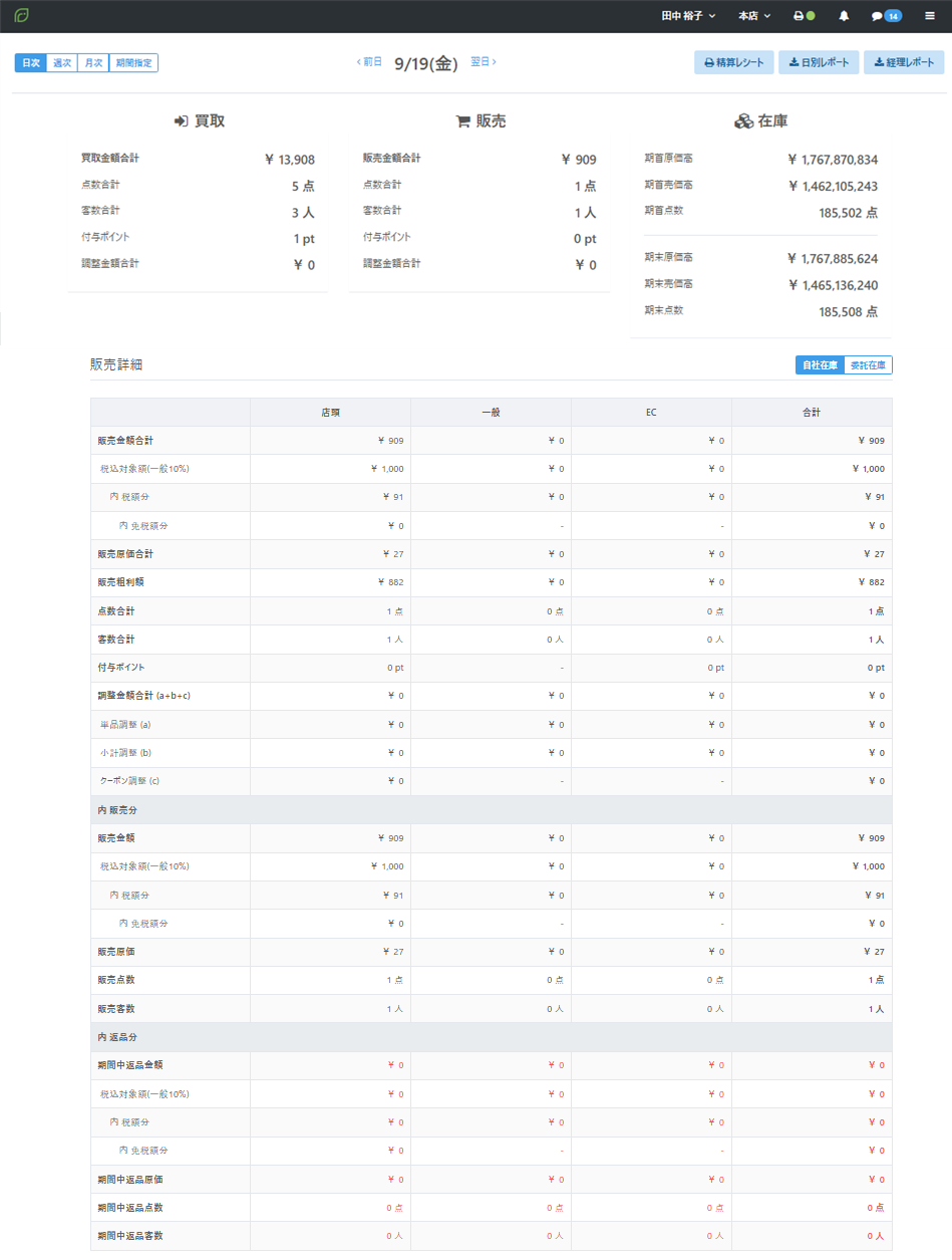【店頭販売】【一般販売】【EC】によって計上された金額などの合計を表示します。