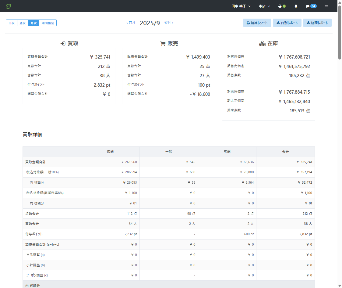 【店頭買取】【一般仕入】【宅配買取】によって計上された金額などの合計を表示します。
