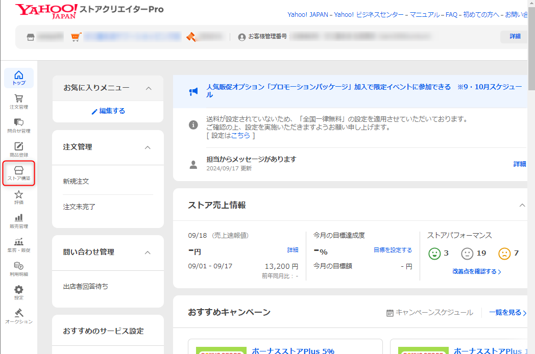 ①ストアクリエイタープロ画面にある【ストア構築】をクリック