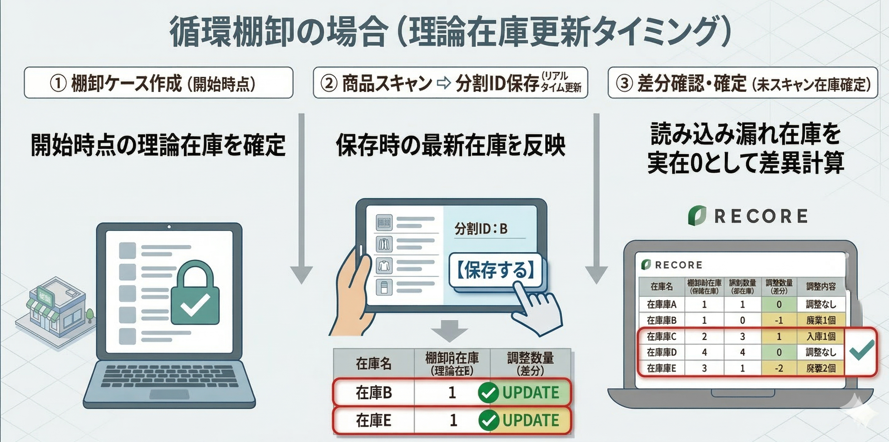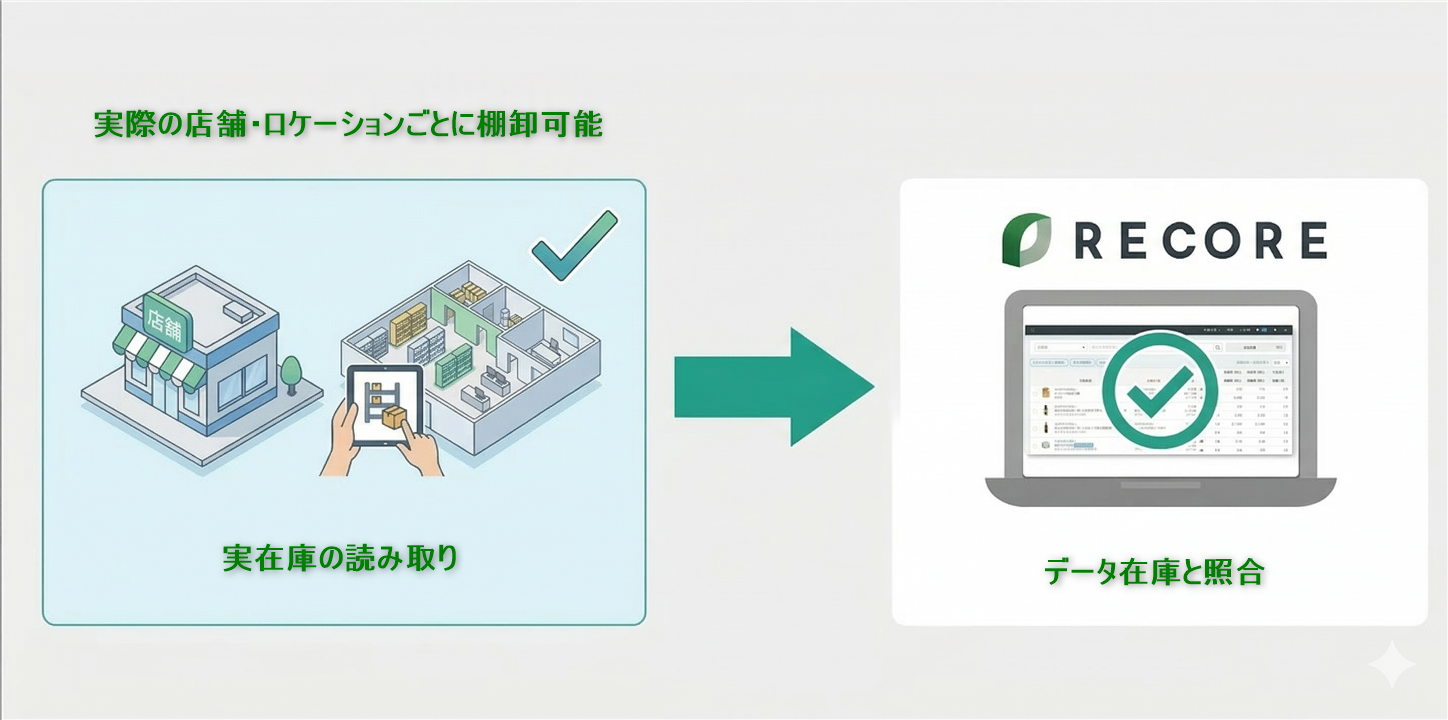 ※棚卸ケース作成時点でRECOREの店舗上に存在しておらず、読み取りしていないものは、棚卸対象外のため更新されません。