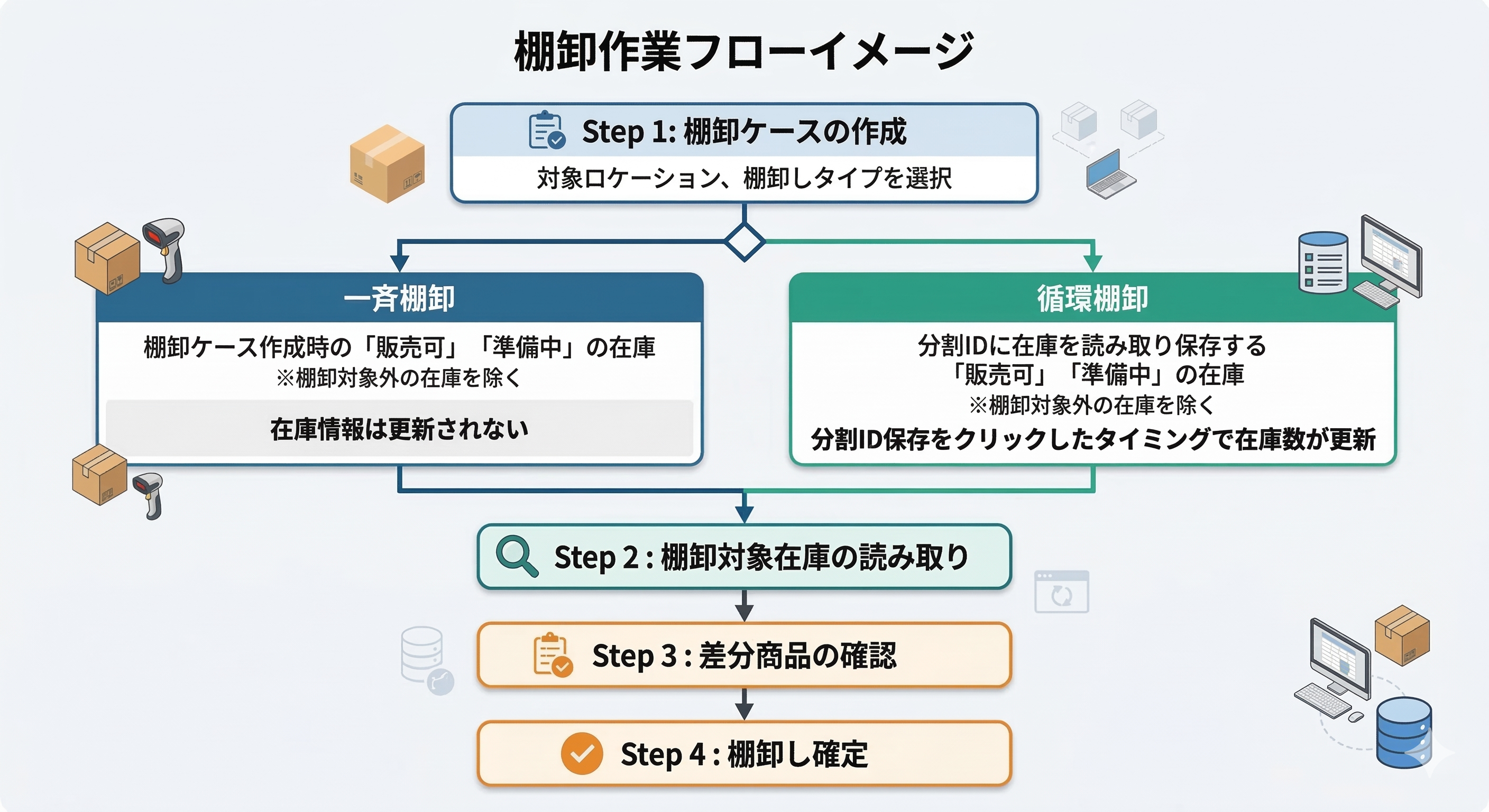 実施タイミング想定 | 営業中(比較的、売買や在庫の変動が少ない時期・時間帯) | 営業終了後(営業時間外) |