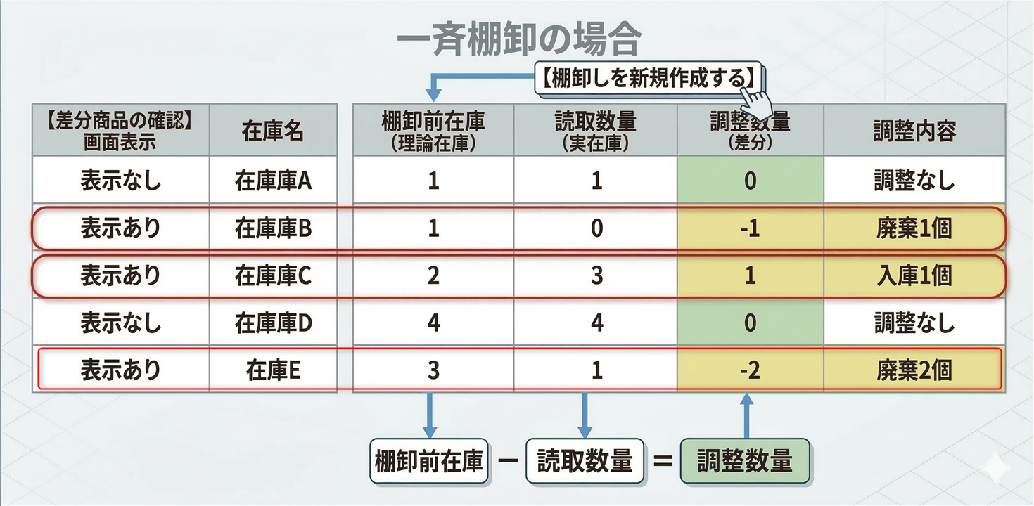 棚卸前在庫(理論在庫)- 読取数量(実在庫) = 調整数量(差分)