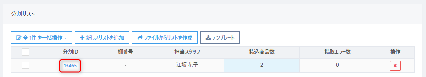 【分割ID】の該当番号をクリックすると、読み取りした内容の反映状況が表示されます。
