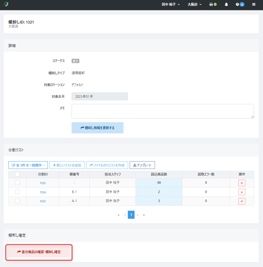 内容を確認し、棚卸結果を確定します。確定後は、差分が在庫データへ反映されます。