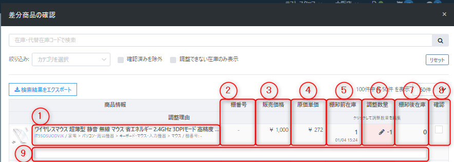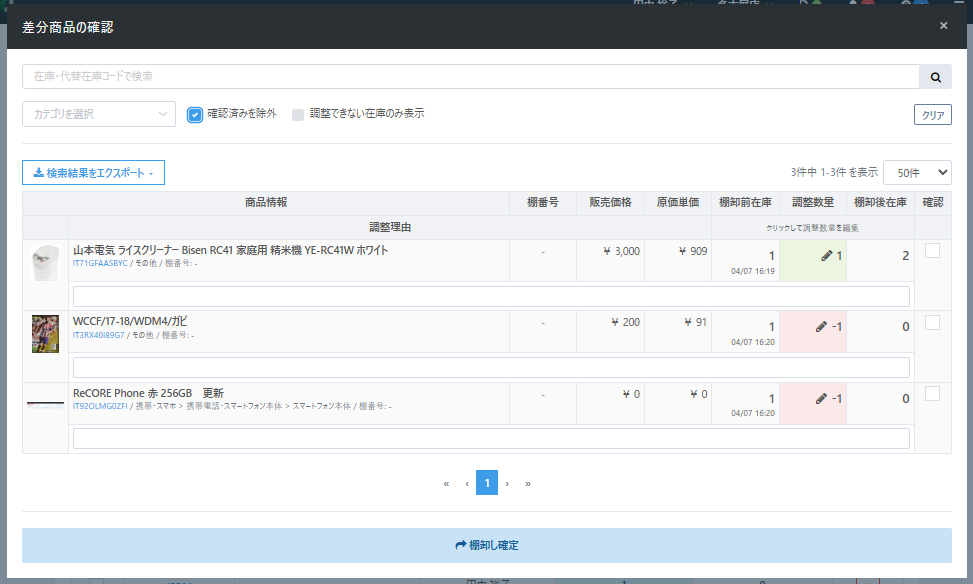 その後に、再度【差分商品の確認・棚卸し確定】ボタンをクリックのうえ、改めて【差分商品の確認】画面より内容を確認し、調整が必要な場合のみ調整数を変更します。