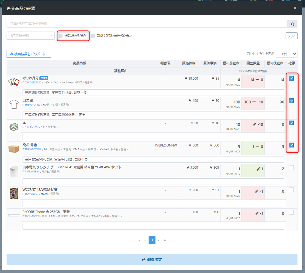 再確認した在庫は、【確認】ボックスにチェックを入れます。チェック後に【確認済を除外】をクリックすると、確認済の在庫が非表示となり、未確認分のみが表示されます。