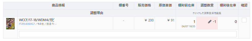 棚卸前在庫に対して調整不要のため、「調整数量」を『-1』から『0』に変更して「調整理由」に確認結果などを入力します。