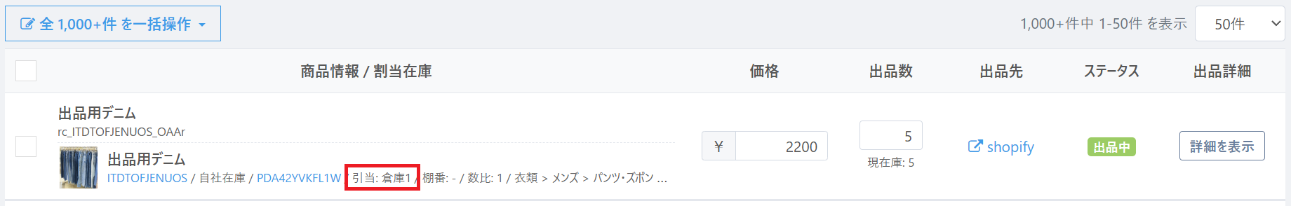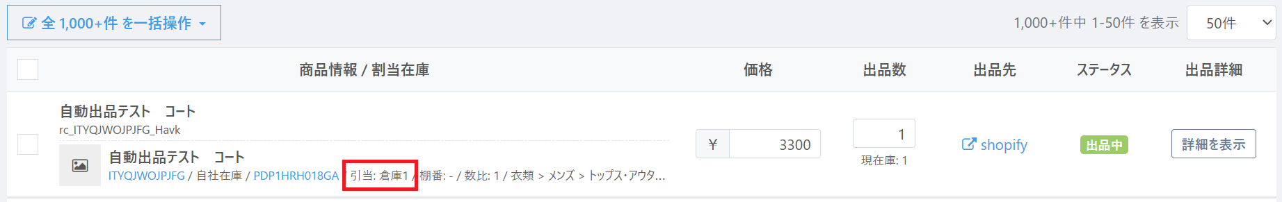 【出品リスト】にも「倉庫1」から在庫が引き当てられた出品を確認することができます。