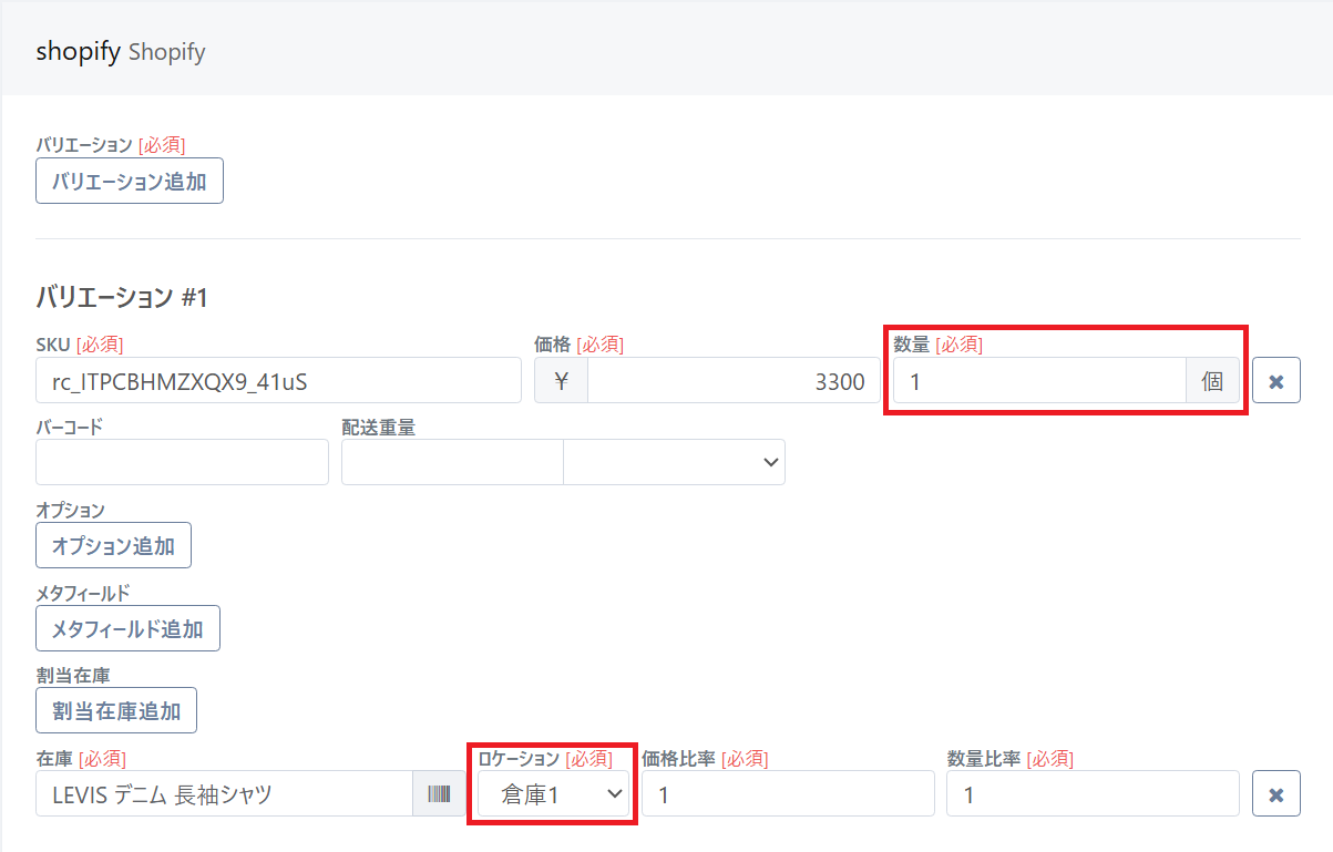 在庫を保管している「倉庫1」にロケーションを変更し、「数量」を1に変更します。