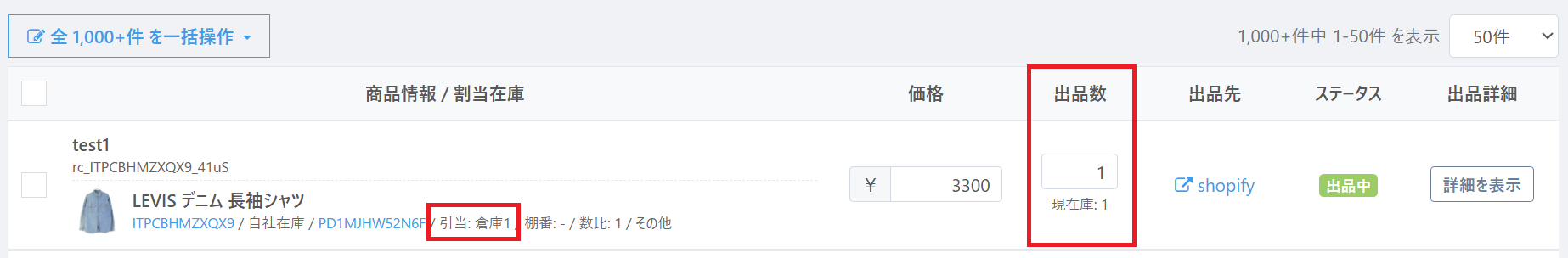 【出品リスト】にて「倉庫1」のロケーションから引き当てられ、現在庫・出品数ともに「1」の出品が作成されます。