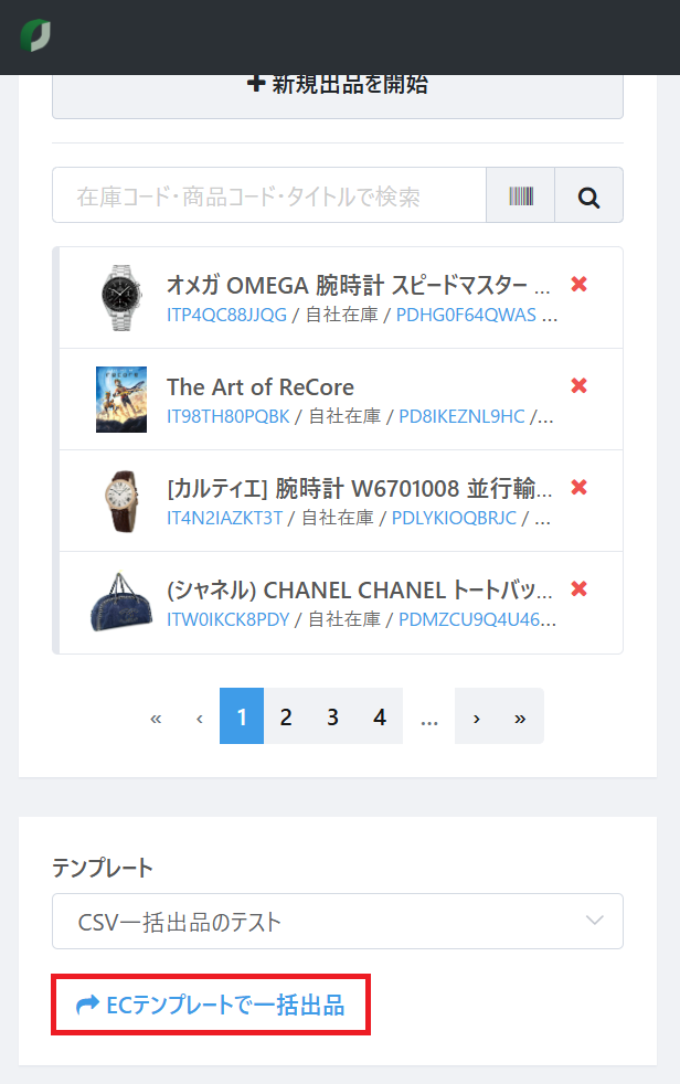 同画面のEC【出品待ち】より「ECテンプレートで一括出品」をクリックします。