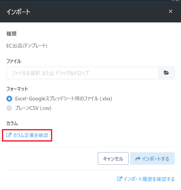 インポート画面に戻り、【Excel・Googleスプレッドシート用のファイル】を選択して【インポートする】をクリック