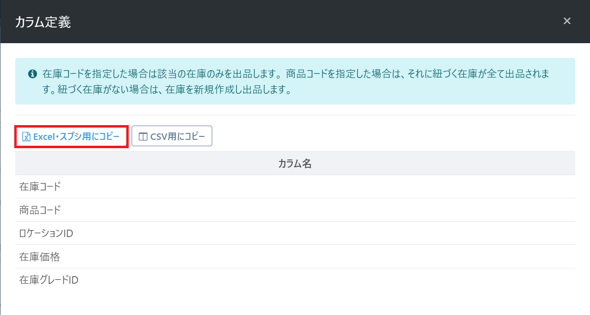 表示された画面より、「Excel・スプシ用にコピー」をクリックし、出品に必要なカラムをコピーします。