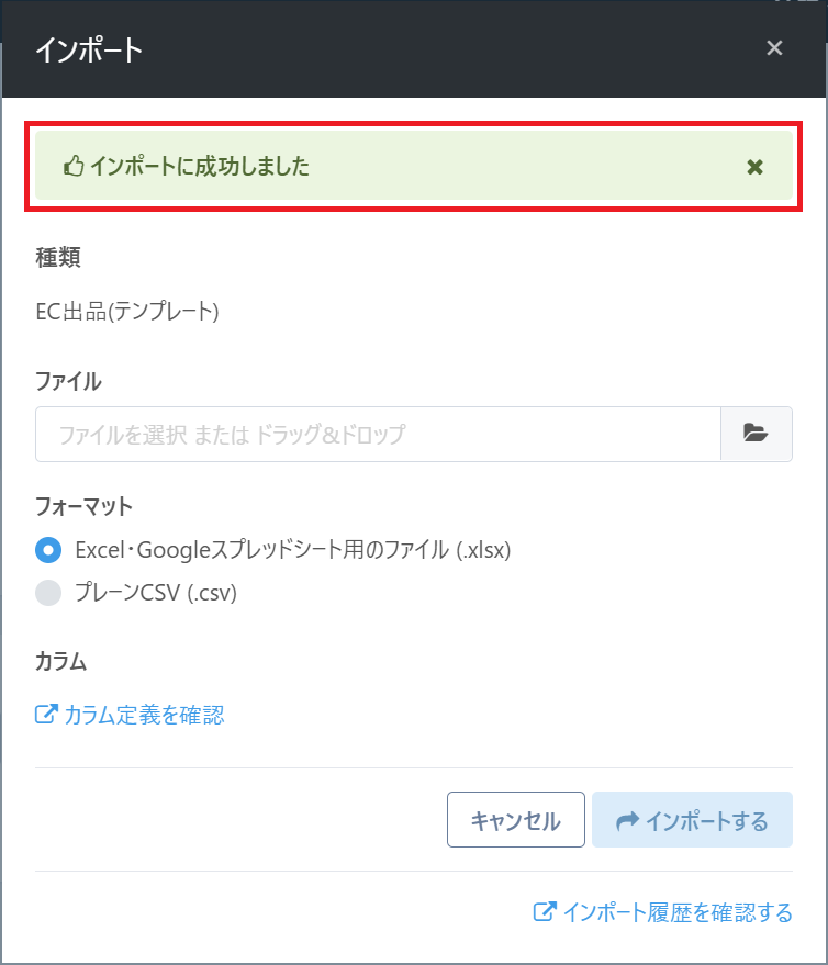 インポートを実行し、問題なくインポートが完了すると、以下の画像のように「インポートに成功しました」とメッセージが表示されます。