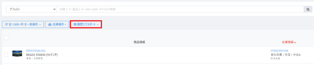 【在庫リスト】画面の左上にある【履歴エクスポート】をクリックします。
