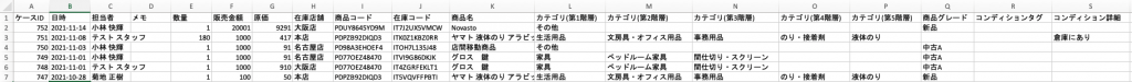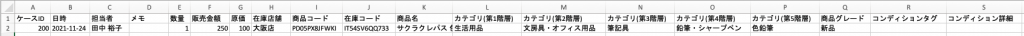 ケースID/日時/担当者/メモ/数量/販売金額/原価/在庫店舗/商品コード/在庫コード/商品名/カテゴリ(第1階層)/カテゴリ(第2階層)/カテゴリ(第3階層)/カテゴリ(第4階層)/カテゴリ(第5階層)/商品グレード/コンディションタグ/コンディション詳細