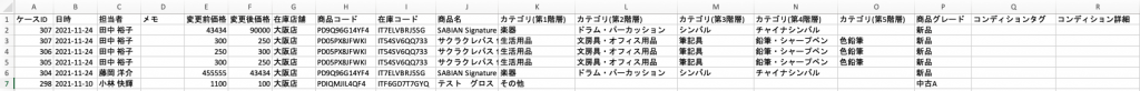 ケースID/日時/担当者/メモ/変更前価格/変更後価格/原価/在庫店舗/商品コード/在庫コード/商品名/カテゴリ(第1階層)/カテゴリ(第2階層)/カテゴリ(第3階層)/カテゴリ(第4階層)/カテゴリ(第5階層)/商品グレード/コンディションタグ/コンディション詳細