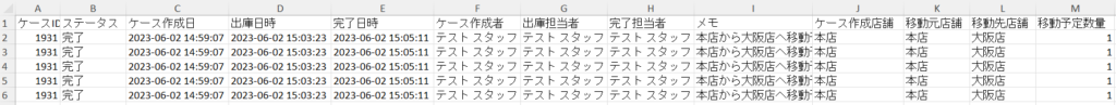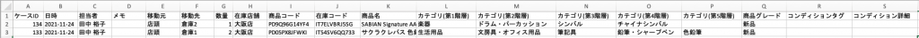 ケースID/日時/担当者/メモ/移動元/移動先/数量/在庫店舗/商品コード/在庫コード/商品名/カテゴリ(第1階層)/カテゴリ(第2階層)/カテゴリ(第3階層)/カテゴリ(第4階層)/カテゴリ(第5階層)/商品グレード/コンディションタグ/コンディション詳細