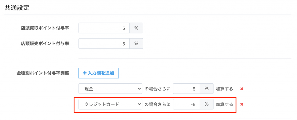 設定内容: 【共通設定】店頭買取ポイント付与率を5% 【金種別ポイント付与率調整】の「現金」を5% 【金種別ポイント付与率調整】の「クレジットカード」を-5%