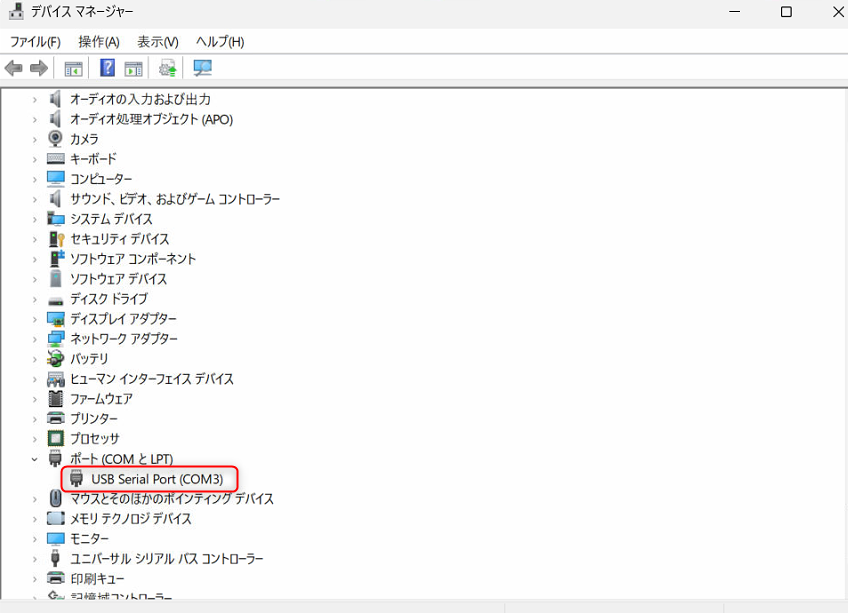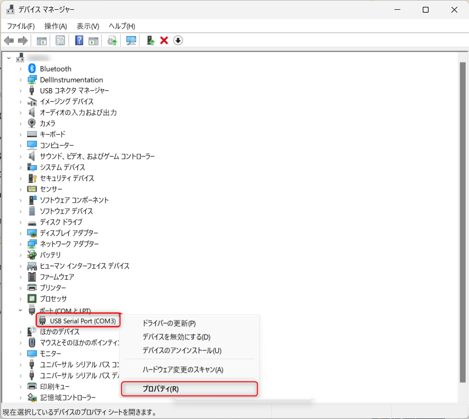 「ポート(COMとLPT)」>「USB Serial Port(COM〇)」を右クリックし、「プロパティ」をクリック