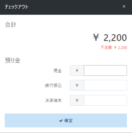 残金を【現金】欄に金額入力ののうえ、支払い【確定】をクリックします。