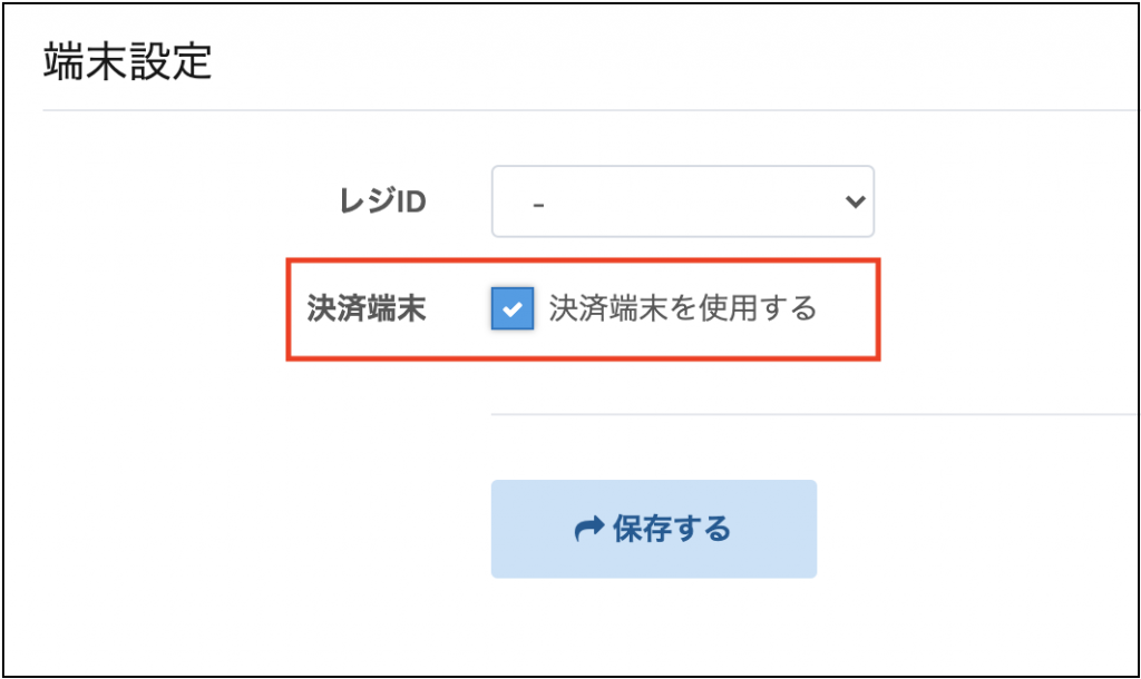 改めて、【設定>端末設定】より、【決済端末を使用する】にチェックを入れ【保存する】をクリックします。