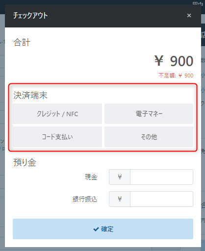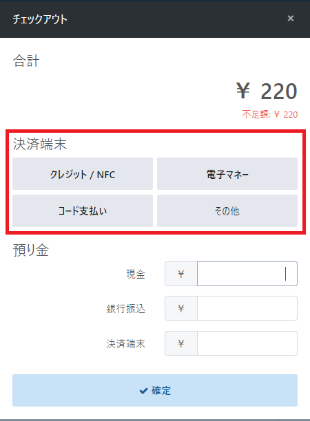その後【預り金の入力】をクリックして表示されるチェックアウト画面にて、決済端末の『電子マネー』をクリックします。