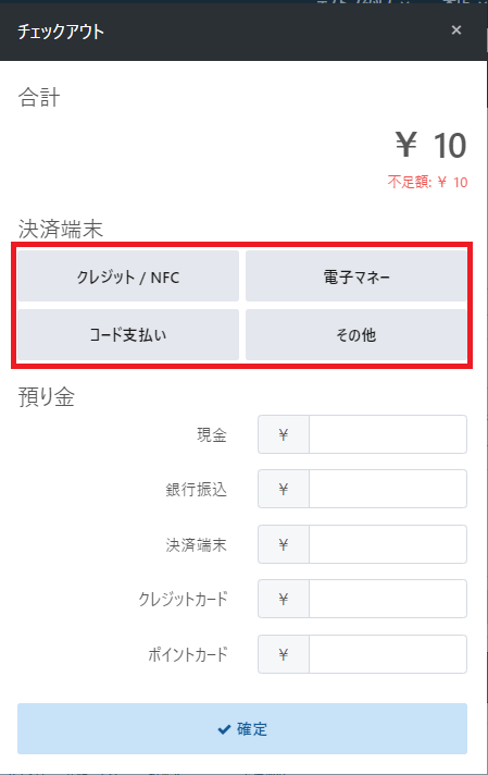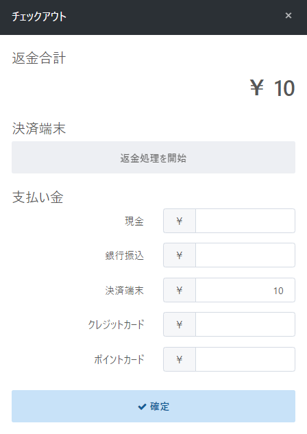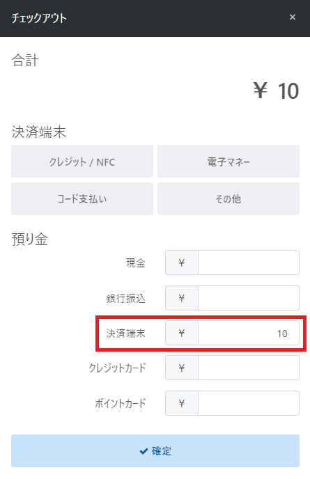 決済端末側で処理が完了すると【決済端末】の決済項目に金額が自動で反映されますので、間違いなければ【確定】をクリック。