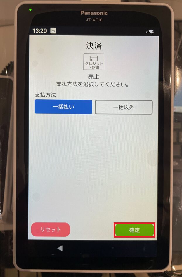決済端末に表示された支払い方法を選択のうえ、【確定】をクリックします。