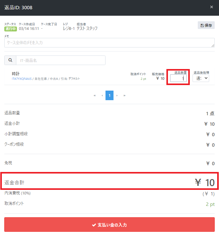 表示された返品ケースにて【返品数量】を入力すると自動で【返金合計】に返金金額が反映されます。