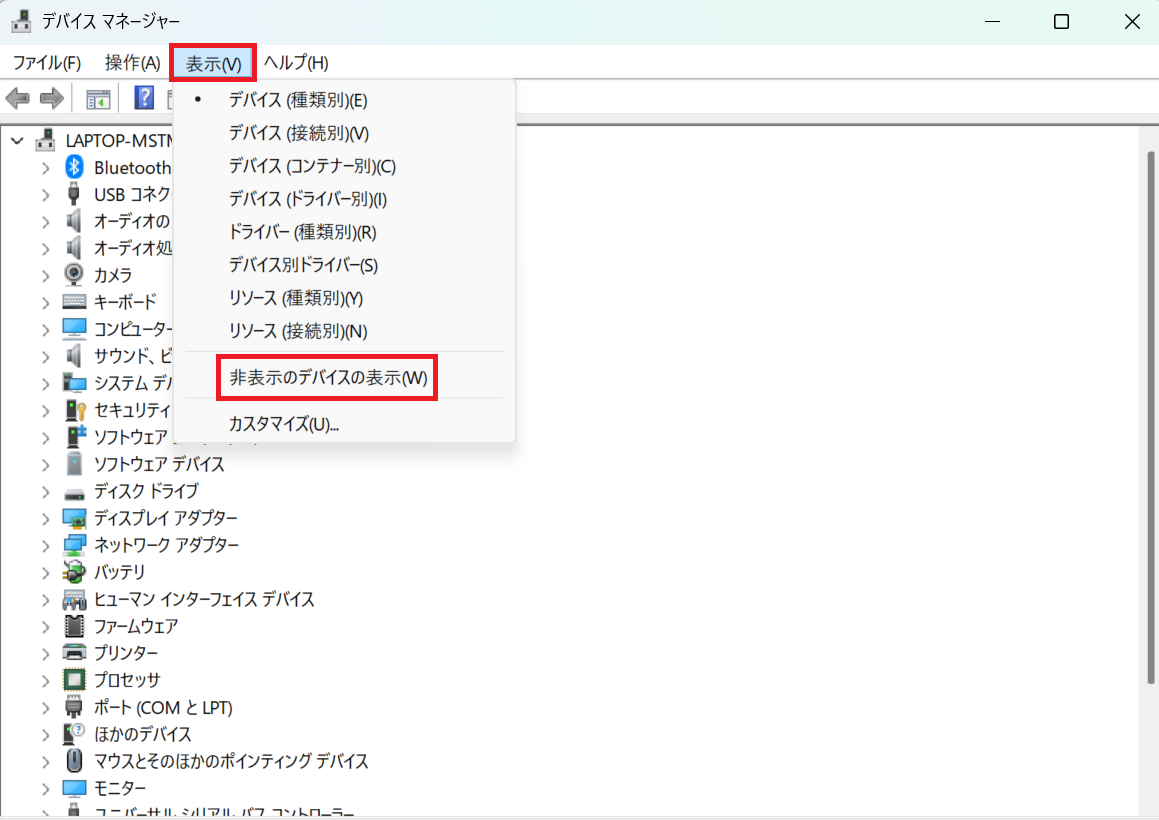表示されたデバイスマネージャーのメニューより「表示(V)」をクリックし、「非表示デバイスの表示(W)」をクリック