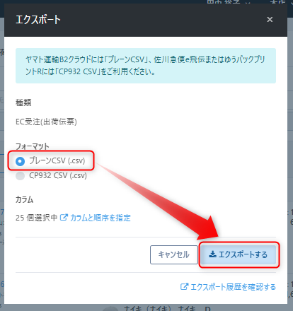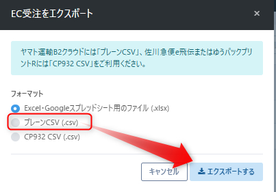 【プレーンCSV】にチェックを入れて「エクスポートする」をクリックする