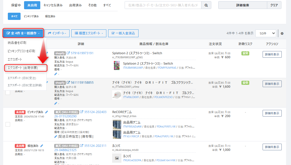 【選択中の〇件を一括操作】より【エクスポート(出荷伝票)】をクリックする