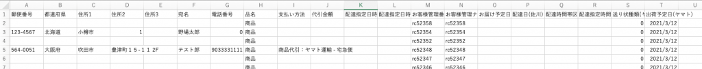 なお、CSVには発注者の情報(住所、宛名、電話番号等)、品名等に加え、発注時に指定した配送指定などの情報が記載されます。