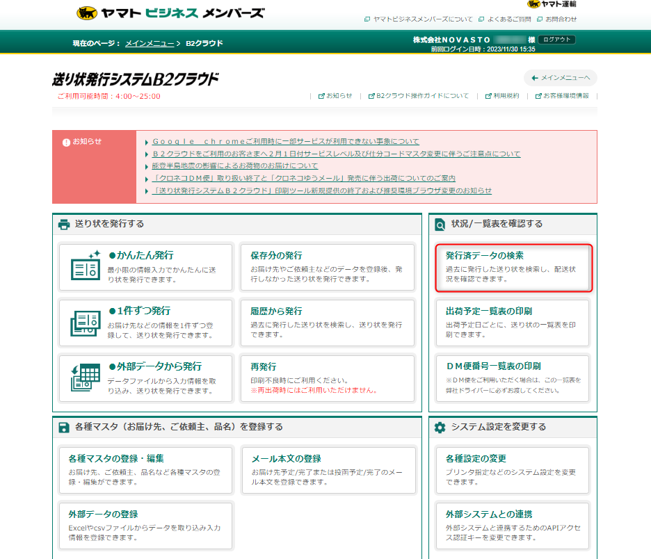システム名:ヤマトビジネスメンバーズ「送り状発行システムB2クラウド」