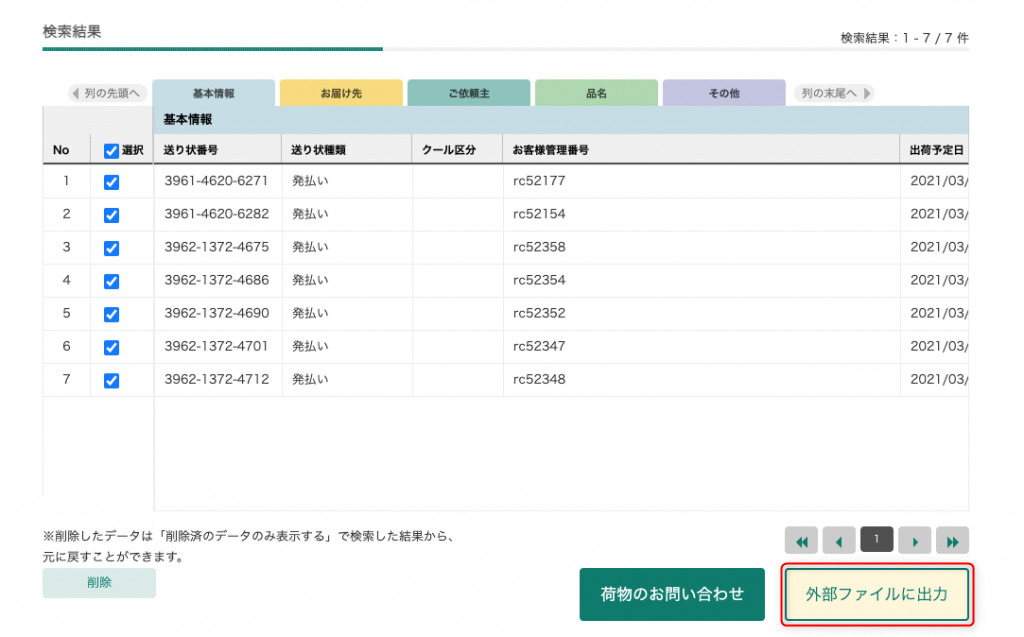 発行した対象のデータを表示のうえ、【外部ファイルに出力】をクリック