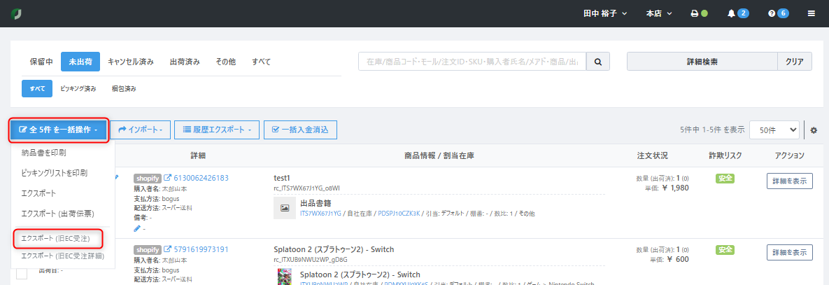 【選択中の〇件を一括操作】より【エクスポート(旧EC受注)】をクリックする