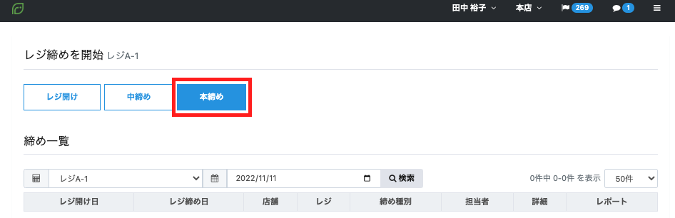 ①【会計>レジ締め】画面より当該「レジ」を指定を確認のうえ【本締め】ボタンを1度クリックします。